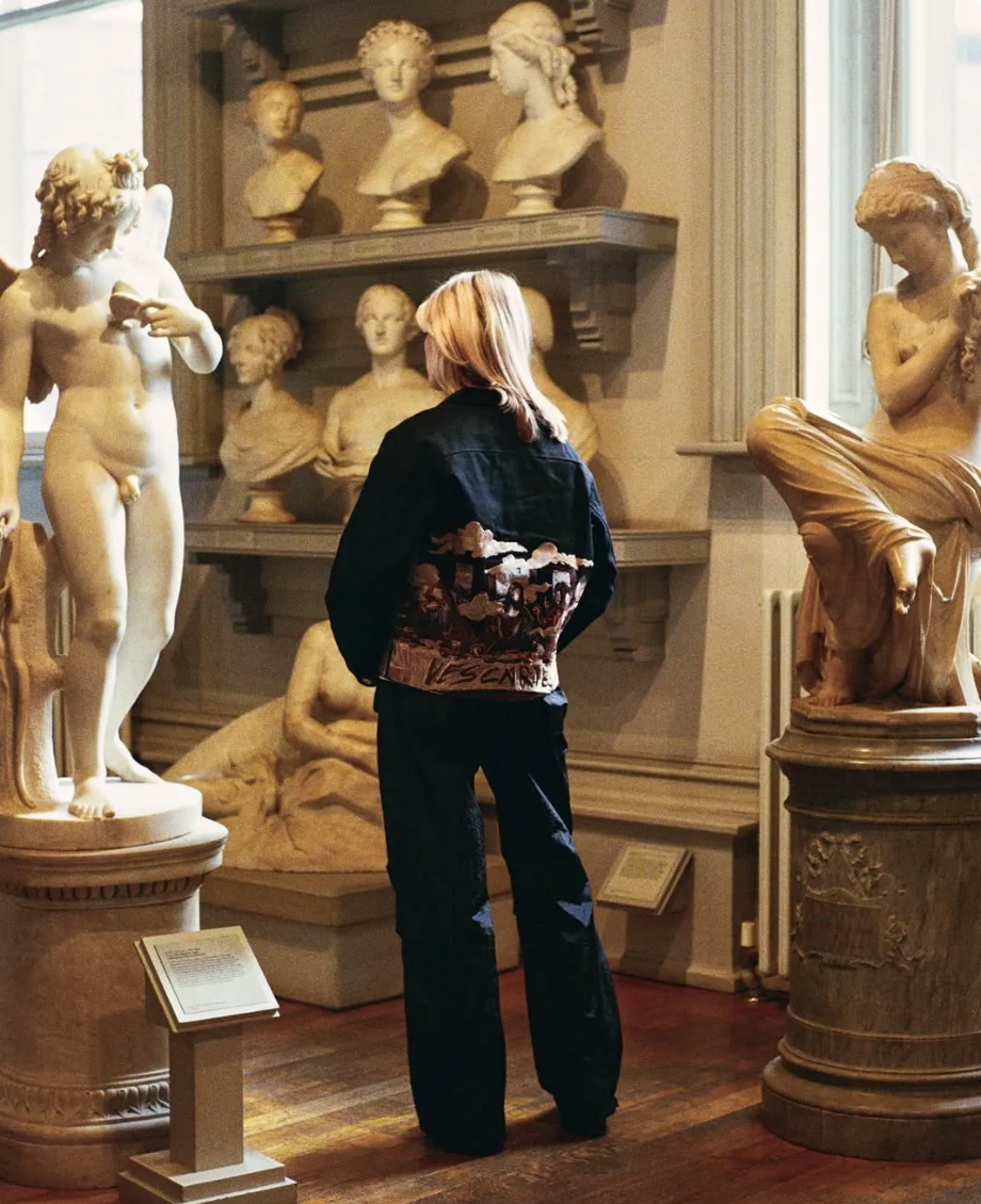 The intricate embroidery stretches across both the front and back, depicting the dramatic scene in stylized detail, contrasted by surreal cloud motifs and a bold graffiti-style "DESCARTES" tag—blending classical art with modern philosophy and rebellious spirit.