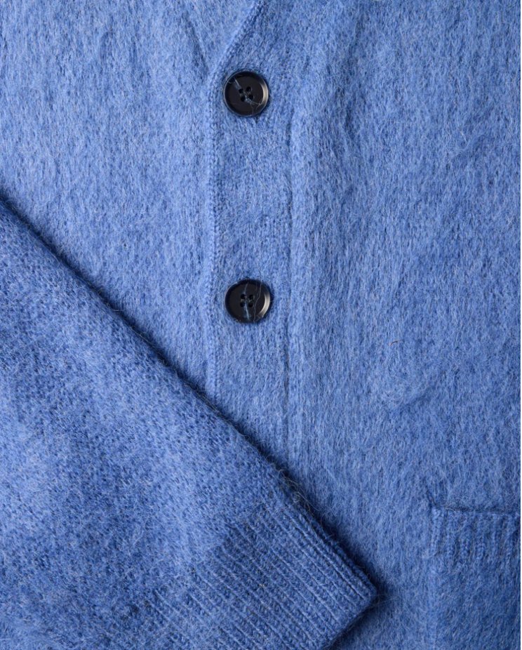 •Wool/Mohair Mix•Loose cropped fit•Embroidery on pocket•Cobalt blue colour•Fake tortoise buttons•Open hip pockets